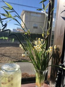 筋トレルームの植物もすくすく成長し、お隣の塩谷さんから毎年恒例水仙頂きました![]()