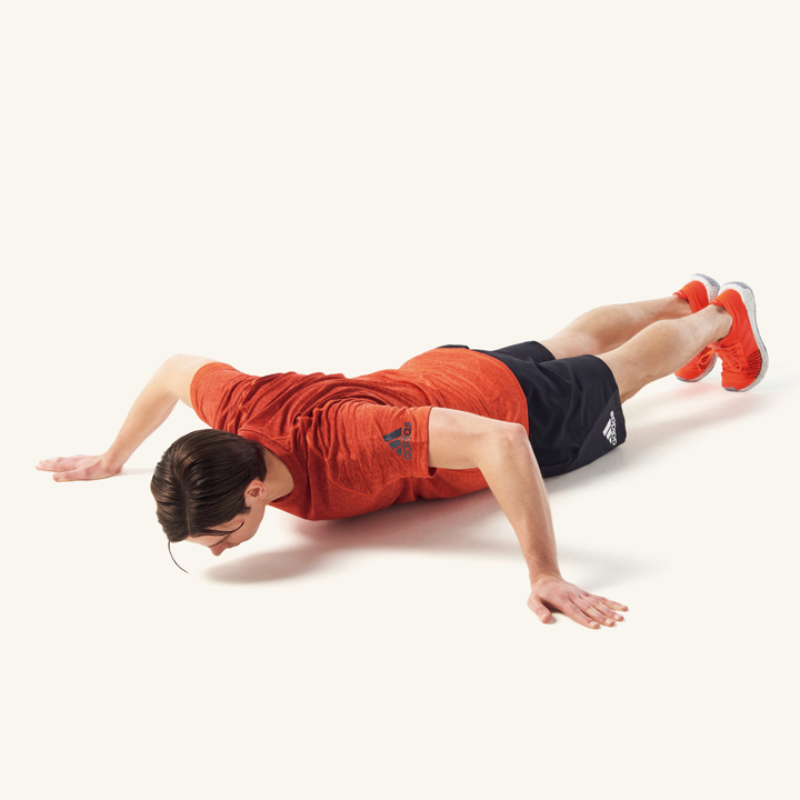 3.息を吸いながら肘を曲げ、体を床に近づける